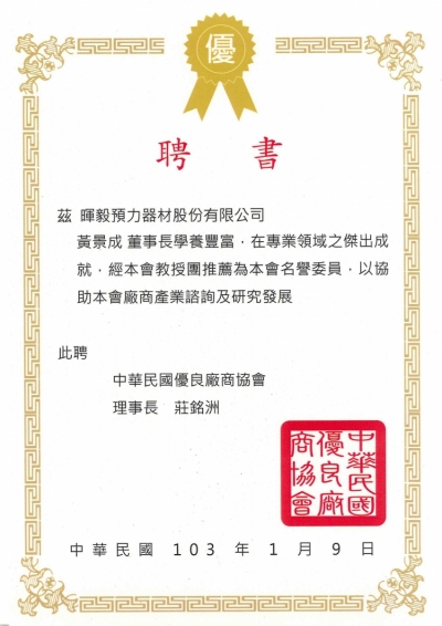 我司榮幸受 中華民國優良廠商協會 邀請,經評鑑考核,獲得一致支持及認同,在此感謝;並給予我們鼓勵及方向,讓我們有源源不絕的動力,繼續創造美好的橋樑未來。全球華人企業楷模獎 / 榮譽證書 / 聘書