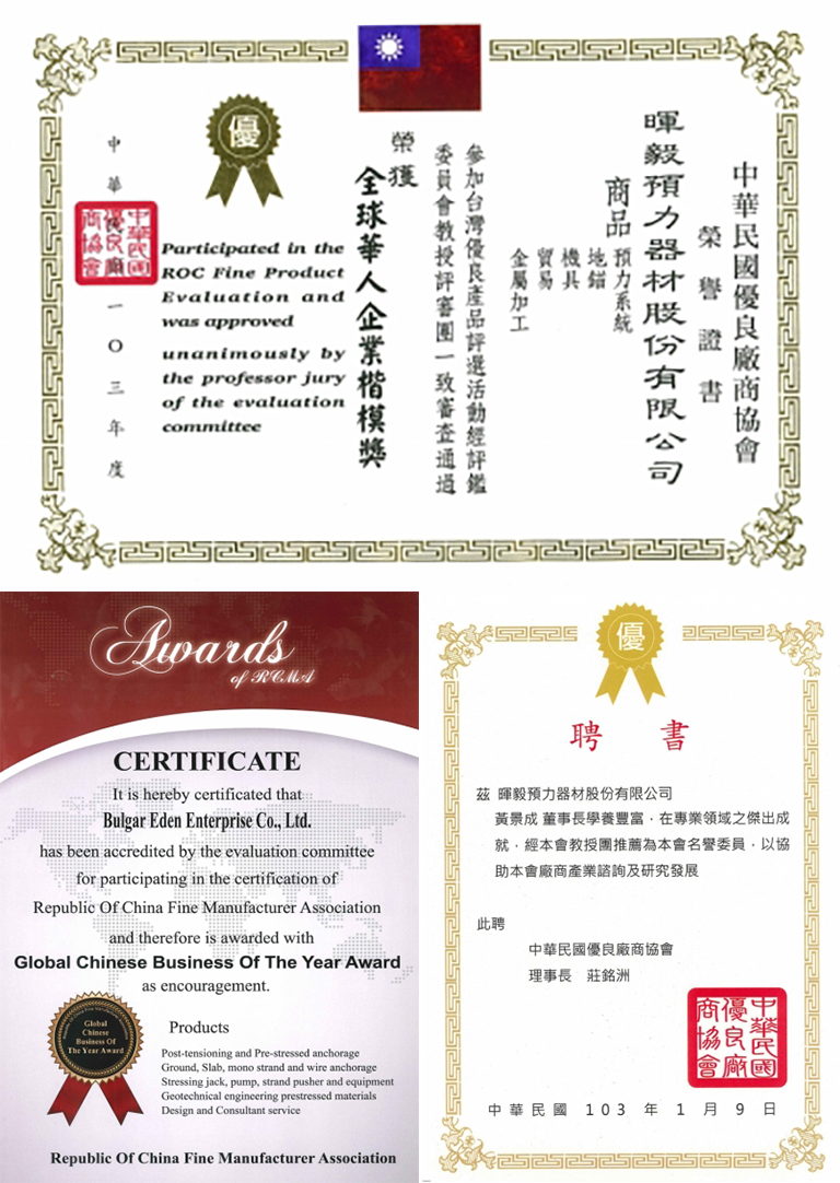 我司榮幸受 中華民國優良廠商協會 邀請,經評鑑考核,獲得一致支持及認同,在此感謝;並給予我們鼓勵及方向,讓我們有源源不絕的動力,繼續創造美好的橋樑未來。評鑑完成時間:2014年2月20日
