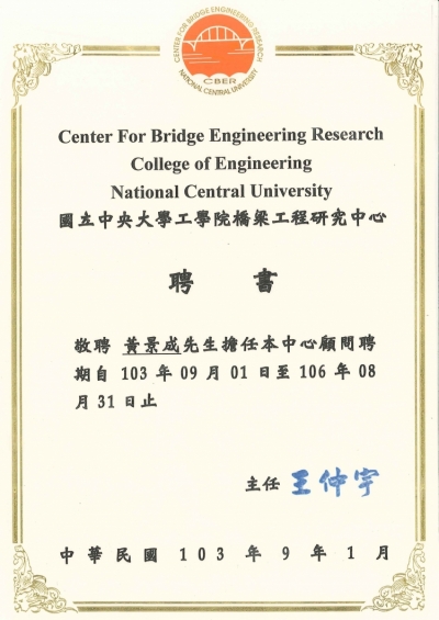 The Center for Bridge Engineering Research College of Engineering National Central University engage Bulger Eden Enterprise Co., LTD. CEO. Mr. Huang Chin Cheng as senior consultant.