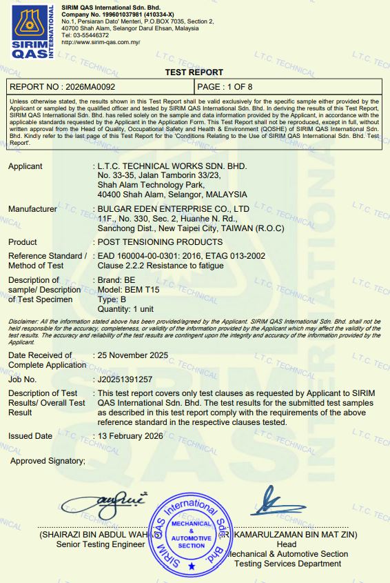 Bulgar Eden Enterprise Co., LTD announced that its BE Post-Tensioning System officially obtained SIRIM certification on February 13, 2026. SIRIM (Standards and Industrial Research Institute of Malaysia), under the Ministry of International Trade and Industry (MITI), is a nationally recognized authority responsible for setting technical standards and conducting product certification in Malaysia. Its certification process is known for its rigor, covering documentation review, laboratory testing, product evaluation, and on-site verification.