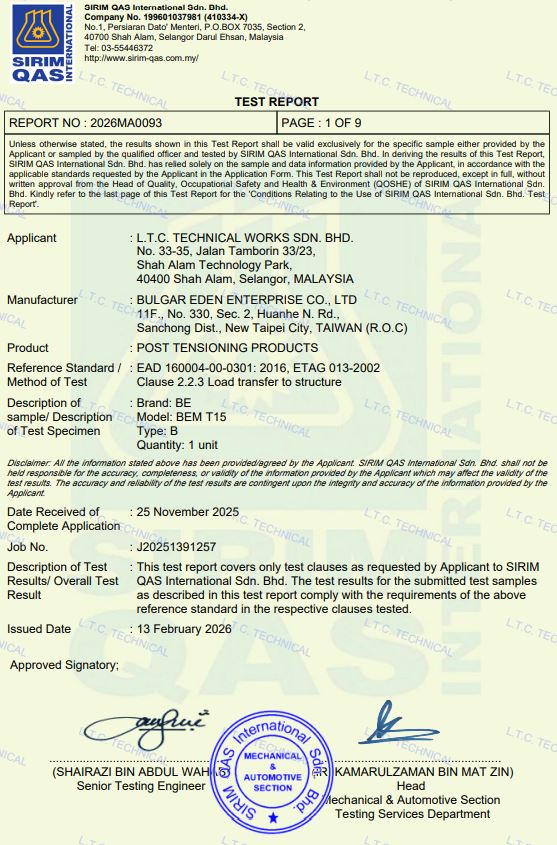 暉毅預力器材股份有限公司(Bulgar Eden Enterprise Co., LTD)之 BE Post-Tensioning 系統,已於2026年2月13日正式取得馬來西亞 SIRIM(Standards and Industrial Research Institute of Malaysia)認證。SIRIM 隸屬於馬來西亞國際貿易與工業部(MITI),為當地具代表性的國家級標準與品質認證機構,其審查流程嚴謹,涵蓋文件審核、試驗規劃、實驗室執行及產品評估等多個面向,對品質控管要求相當全面。